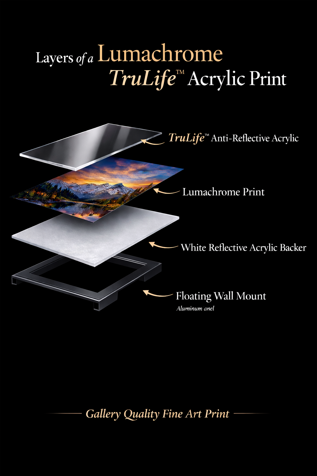 Unlike traditional acrylic, TruLife® Acrylic offers unparalleled clarity, allowing light to pass through the surface without distortion. The result is extraordinary depth, richness, and dimensionality, giving each image a luminous, almost three-dimensional presence.